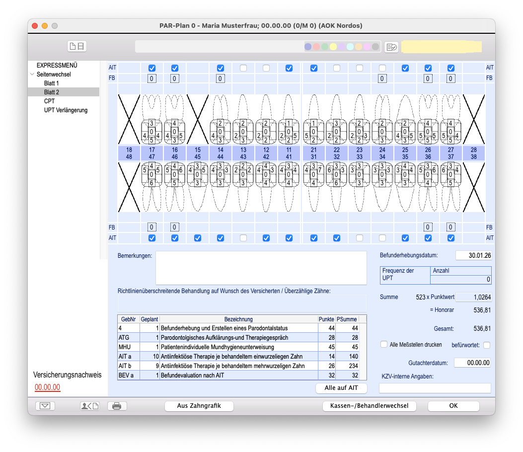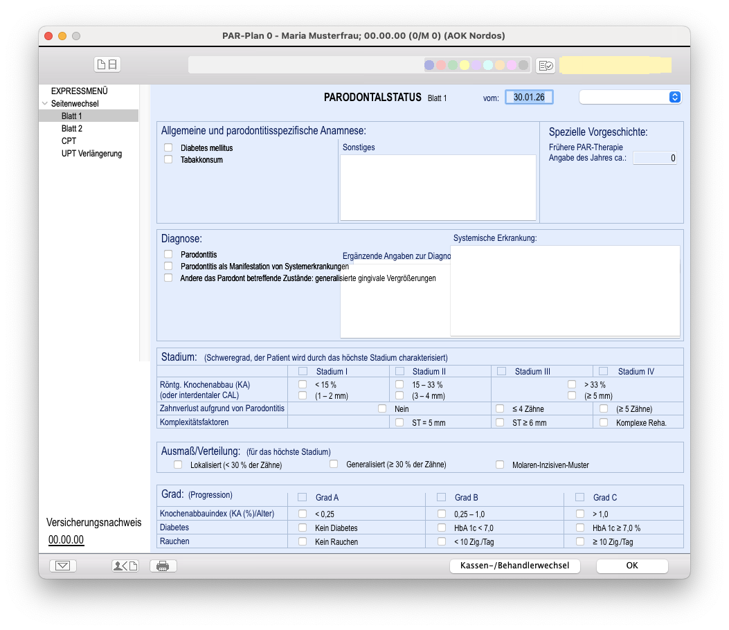 2. Antrag bei der Krankenkasse Vor Behandlungsbeginn stellt die Praxis einen Antrag bei Ihrer Krankenkasse. Dafür werden die Befunde dokumentiert: Taschentiefen, Blutungsstellen, Lockerungsgrade, Röntgenbefund. Die Genehmigung ist in der Regel Routine.