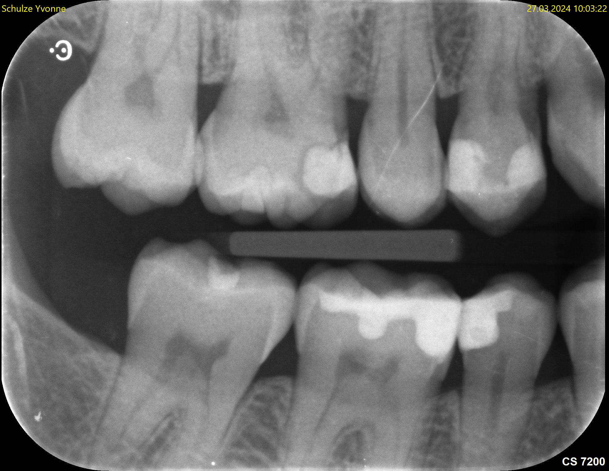 Die Aufnahme dauert nur Sekundenbruchteile. Da der Sensor nah am Zahn liegt und der Röntgenstrahl gezielt auf einen kleinen Bereich gerichtet ist, liefert der Zahnfilm eine deutlich höhere Detailschärfe als das OPG (Orthopantomogramm). Feine Strukturen wie beginnende Karies, Wurzelkanäle oder der exakte Verlauf des Knochens an einzelnen Zähnen lassen sich präziser beurteilen.
