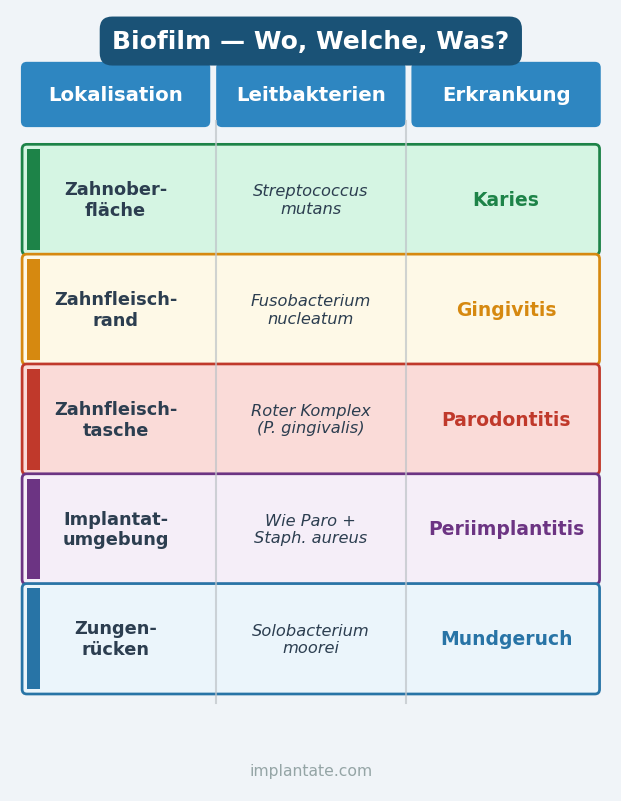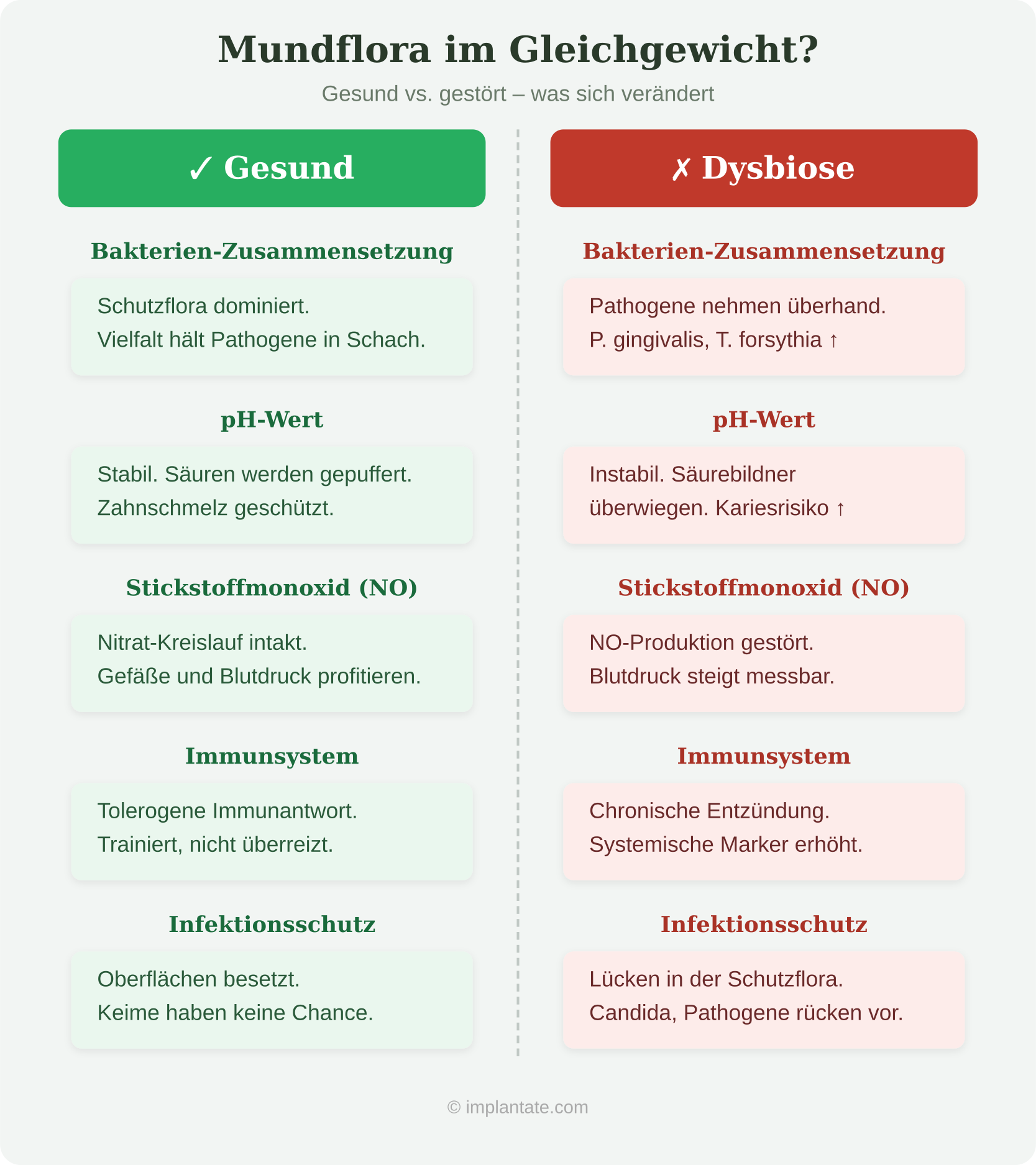 Das Grundprinzip der Periimplantitis ist identisch mit dem der Parodontitis: Ein gereifter Biofilm mit dominierenden Anaerobiern des Roten Komplexes löst eine Immunreaktion aus, die Knochen abbaut. Die Keime sind weitgehend dieselben – P. gingivalis, T. forsythia, T. denticola und F. nucleatum – ergänzt um opportunistische Spezies wie Staphylococcus epidermidis und Enterobacteriaceae, die an natürlichen Zähnen seltener auftreten.