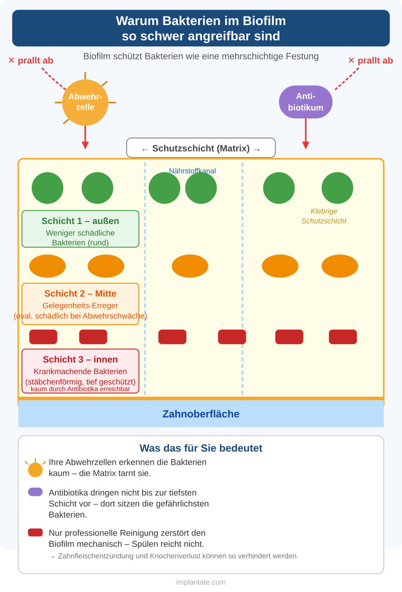 Die extrazelluläre Matrix ist das Kernproblem: Sie wirkt wie ein physischer Schutzschild. Abwehrzellen des Immunsystems haben Schwierigkeiten einzudringen. Mundspülungen erreichen nur die äußeren Schichten. Antibiotika, die gegen frei schwimmende (planktonische) Bakterien wirken, scheitern am organisierten Biofilm – die Resistenz steigt im Verbund um ein Vielfaches.