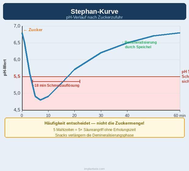 Das Geschehen läuft in einem dynamischen Gleichgewicht ab: Direkt nach dem Essen fällt der pH-Wert unter der Plaque auf Werte um 5 oder tiefer – deutlich unterhalb der kritischen Schwelle von pH 5,5, bei der Hydroxylapatit aus dem Zahnschmelz herausgelöst wird. Hält die Säureexposition zu lange an oder kommt es zu häufig, kann die Remineralisierung durch Speichel und Fluorid nicht mehr mithalten. Der Schmelz verliert Mineralien, die Oberfläche wird porös, und es entsteht eine Läsion.