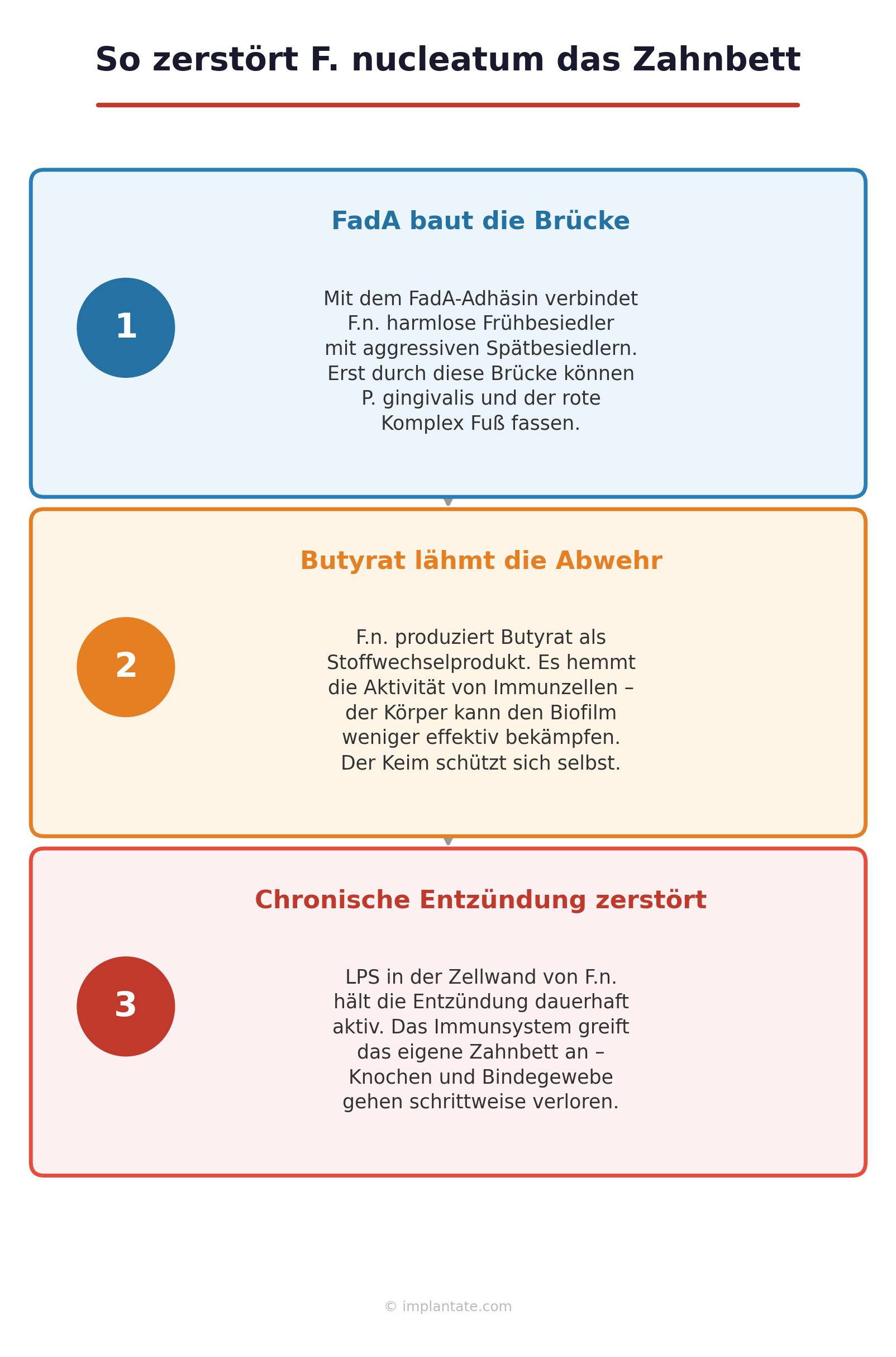 Was F.n. am natürlichen Zahn tut, macht er am Implantat genauso – mit einer wichtigen Besonderheit: Das Implantat hat kein Parodontalligament, keine Sharpey-Fasern, keine Zahnzementschicht. Die biologische Abdichtung gegen Bakterien ist schwächer. Was F.n. einmal als Brücke aufgebaut hat, ist am Implantat deshalb schwerer zu durchbrechen als am natürlichen Zahn.