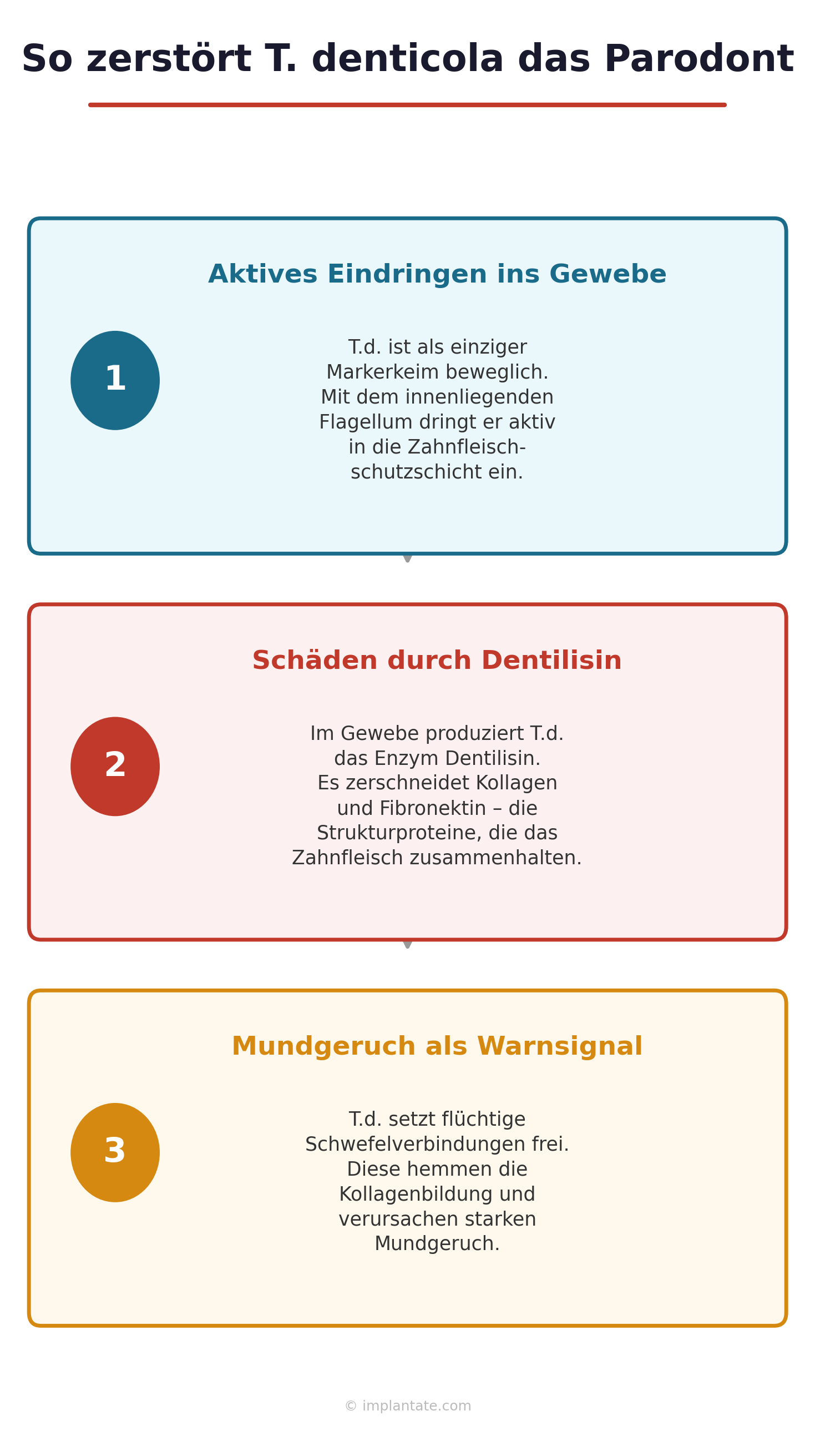 T.d. hat – wie P.g. – Mechanismen entwickelt, um der Immunantwort des Körpers zu entgehen. Seine äußeren Membranproteine stören die Komplementaktivierung – einen wichtigen Arm des körpereigenen Abwehrsystems. Dadurch kann T.d. im Gewebe persistieren und eine chronische Entzündung aufrechterhalten, ohne vollständig eliminiert zu werden. Das ist ein wesentlicher Grund, warum eine Parodontitis ohne Behandlung nicht von allein ausheilt.
