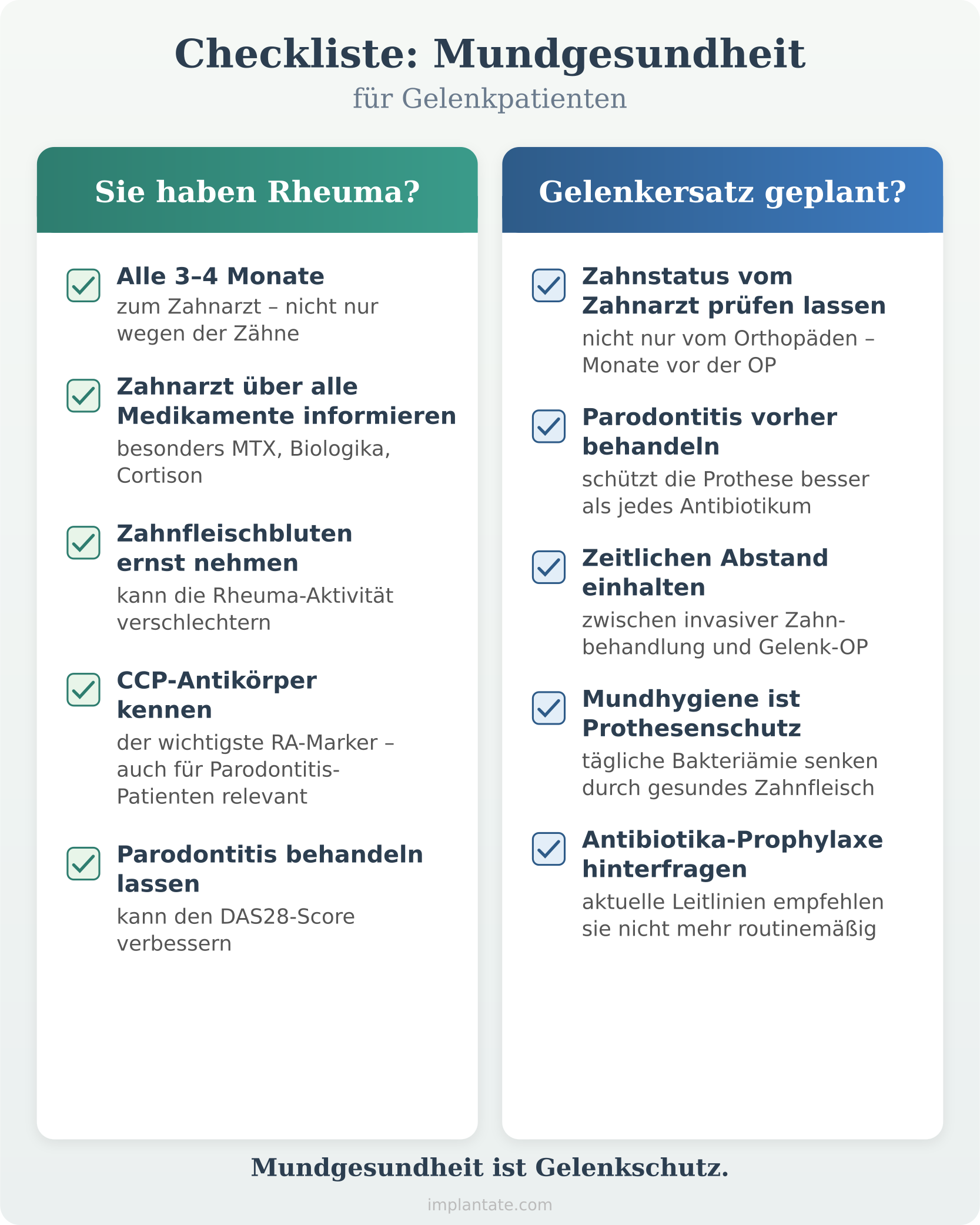 Lassen Sie Ihren Zahnstatus vor der Gelenkoperation vom Zahnarzt – nicht nur vom Orthopäden – überprüfen. Eine bestehende Parodontitis sollte vor dem Eingriff behandelt werden. Das ist für die Langlebigkeit der Prothese wichtiger als die einmalige Antibiotikagabe vor einer Zahnbehandlung. Die beste Fürsorge für den Gelenkersatz beginnt mit einer gründlichen Mundhygiene und regelmäßigen Zahnarztbesuchen – nicht erst nach der Operation, sondern idealerweise schon Monate davor.