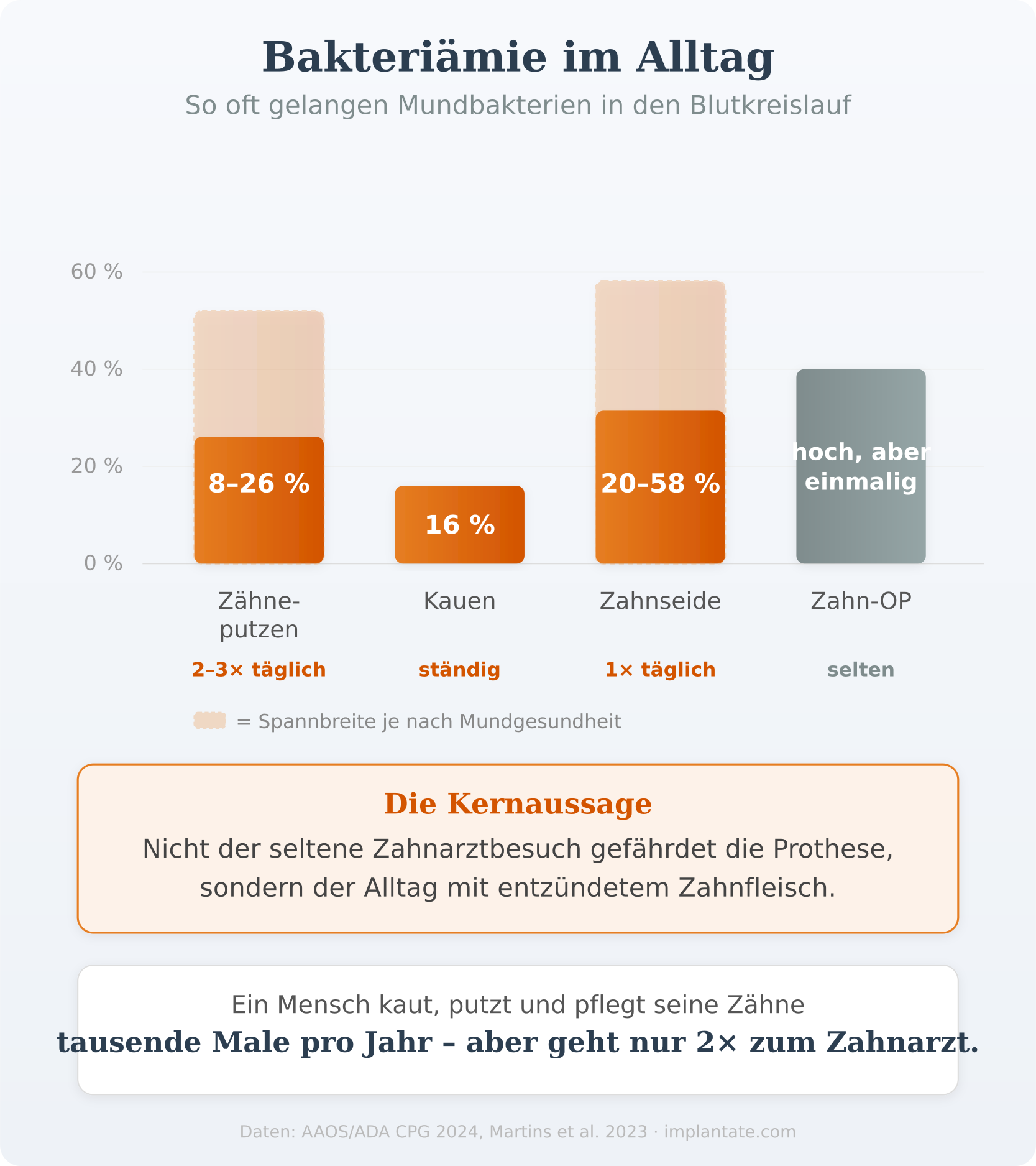 Die entscheidende Erkenntnis aus neueren Studien: Nicht die einzelne Zahnbehandlung ist das Hauptproblem, sondern der dauerhafte Entzündungsherd im Mund. Patienten mit unbehandelter Parodontitis – also blutendem Zahnfleisch, vertieften Taschen und bakteriellen Belägen – haben ein permanent erhöhtes Risiko für Bakteriämien. Die Zahlen sind eindrücklich: Schon ganz alltägliche Aktivitäten spülen Bakterien in den Blutkreislauf – 8 bis 26 Prozent beim Zähneputzen, 16 Prozent beim Kauen, 20 bis 58 Prozent bei der Verwendung von Zahnseide. Bei Zahnfleischentzündungen (Gingivitis) steigen diese Raten weiter an, weil das Gewebe durchlässiger wird. Nicht eine einzelne Zahnbehandlung, sondern diese tägliche, niedrigschwellige Belastung stellt das eigentliche Risiko für die Prothese dar.