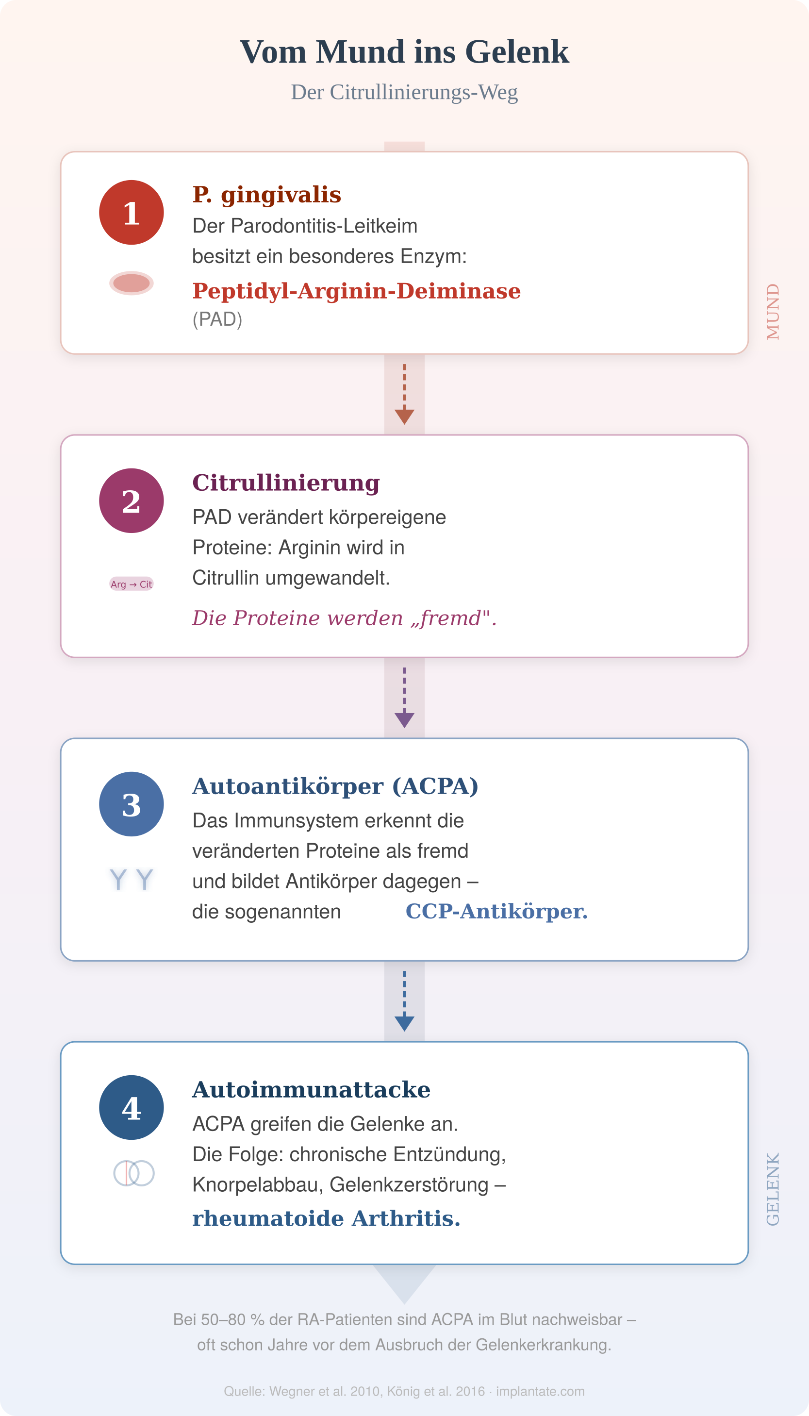 2010 wiesen Wegner und Kollegen nach, dass P. gingivalis menschliches Fibrinogen und α-Enolase citrullinieren kann – zwei Proteine, die als Zielstrukturen der ACPA bei rheumatoider Arthritis bekannt sind. 2016 wurde ein weiteres Bakterium identifiziert, das citrulliniert: Aggregatibacter actinomycetemcomitans, ebenfalls ein Parodontitis-Keim. Dieser Keim löst die Citrullinierung über einen anderen Mechanismus aus – er bildet Leukotoxin A, das in Immunzellen eine unkontrollierte Citrullinierung auslöst. Damit gibt es mindestens zwei Parodontitis-Bakterien, die die Autoimmunkaskade anstoßen können.