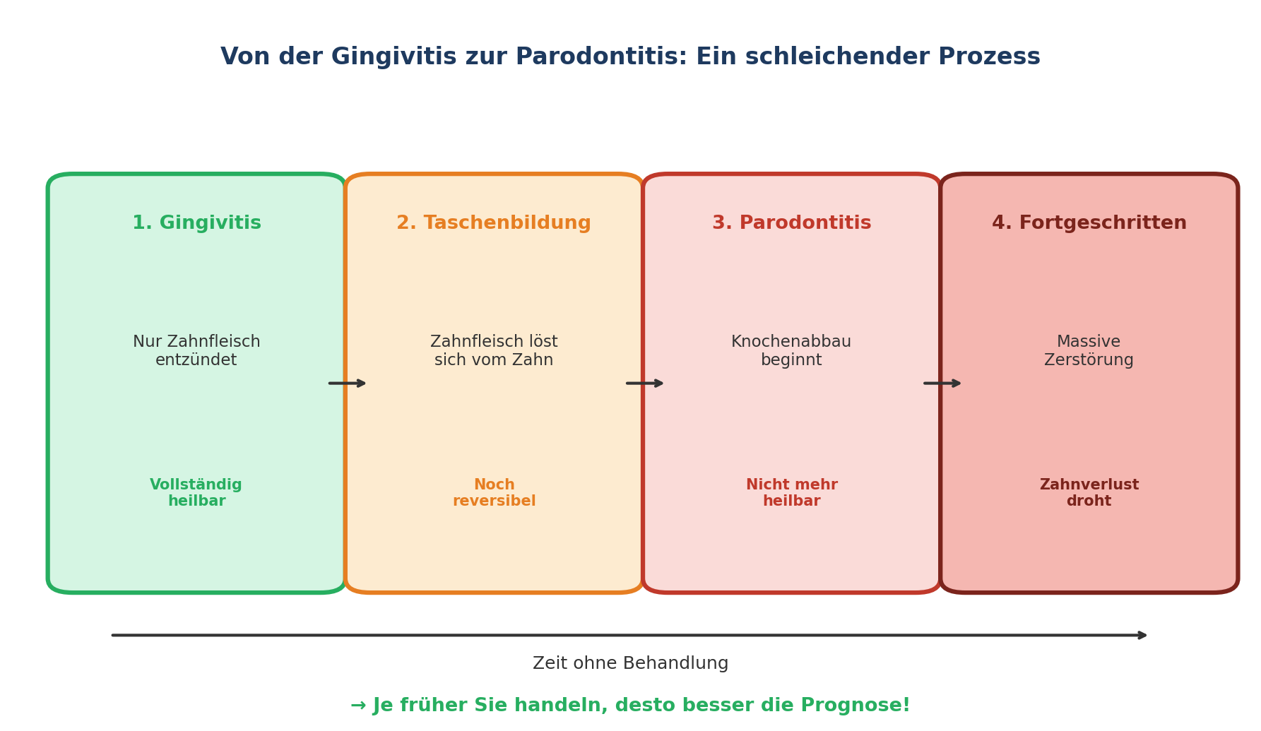 Schritt 1 – Gingivitis: Die Entzündung ist auf das Zahnfleisch beschränkt. Kein Knochenabbau, vollständig reversibel.