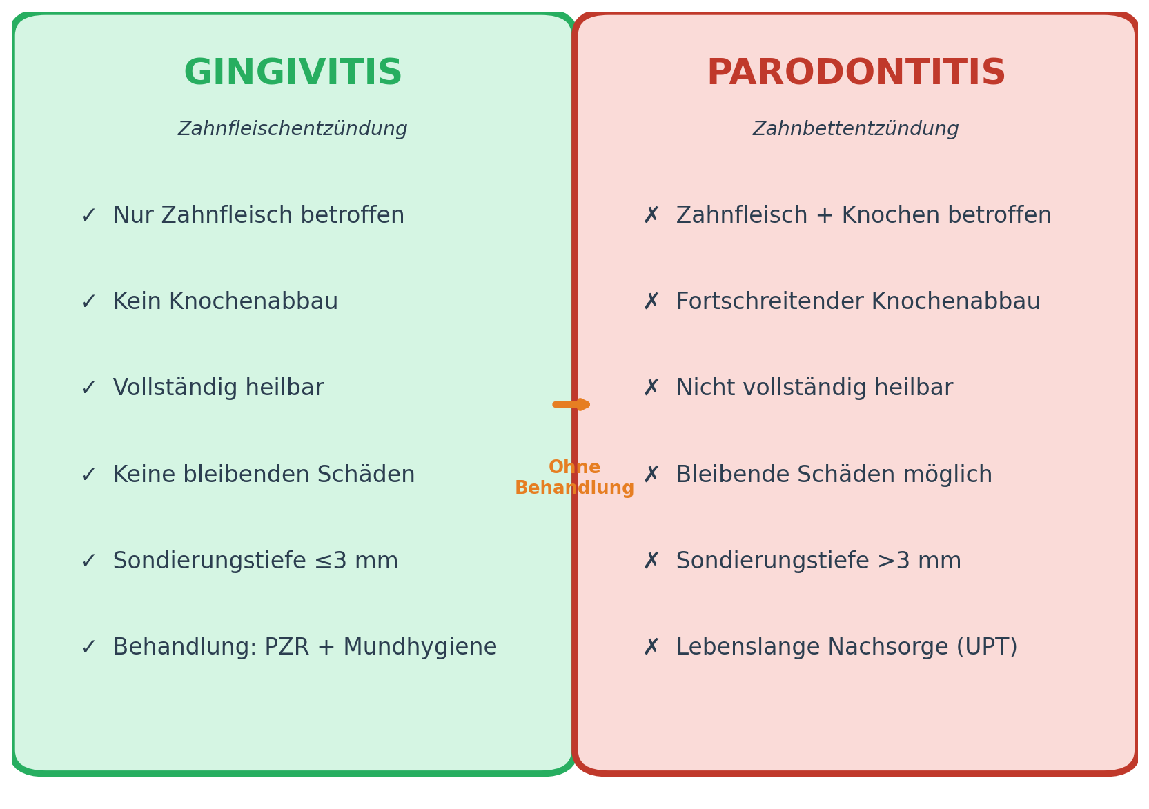 Bei Gingivitis ist nur das Zahnfleisch entzündet – der Knochen ist nicht betroffen, und die Erkrankung ist vollständig reversibel. Bei Parodontitis hat die Entzündung den Kieferknochen erreicht, es kommt zu Knochenabbau, der nicht mehr rückgängig zu machen ist. Ein Patient mit Parodontitis bleibt lebenslang ein Parodontitis-Patient und benötigt dauerhaft Nachsorge.