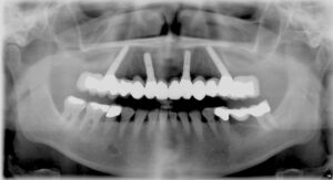 Röntgenbild mit 4 Implantaten und festsitzender Implantatbrücke im Oberkiefer. Beachte die 2 hintern schräg eingesetzten Implantate zum Ausnutzen des Knochenangebots unterhalb der Kieferhöhle (Sinuslift wird vermieden).